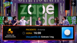 Health professional may add information about the time when a specific patient has to take medicinal products. This information will be presented while the patient is watching TV with a small advice over broadcast. In addition, this information will be sent to smart devices of patient (smartphone and/or tablet). It allows multi-device access, regardless of where the patient is.